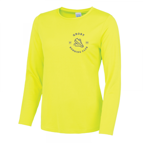 Long sleeve ladies technical t-shirt with Groby Running Club Hi-viz logo to the front breast, and large to the back.